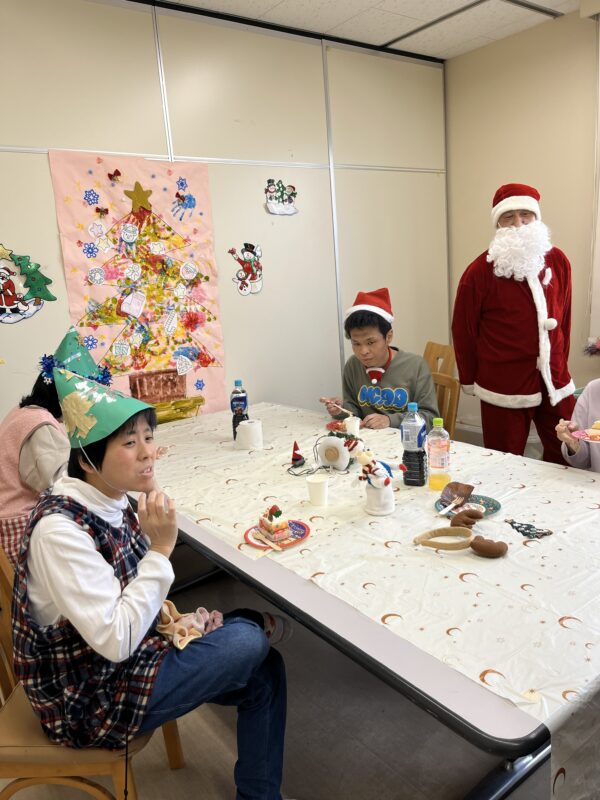 12月19日(金)に生活介護グループはクリスマス会をしました。数日前から「クリスマス会?」「ケーキ?」など職員に聞いてくれる方もいて、とても楽しみにしてくれているようでした。みんなで製作したキラキラつきの帽子を被ったり、サンタの衣装を身につけたり、トナカイのカチューシャを付けたりしてクリスマス気分を盛り上げました。順番に会議室に呼ばれ、中に入ると部屋が飾りつけされていてびっくり!楽しい音楽とサンタさんが出迎えてくれました(笑)ケーキと飲み物はそれぞれ選んで食べました。来年もサンタさんが来てくれますように。。。。。