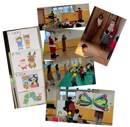「あんぱん・チョコぱん(手あそび)」から始まって、「赤鼻のトナカイ(歌)」でサンタさんとトナカイが登場!!そして「ジャンボリーミッキー」みんなでダンスをしてはじけました☆最後は「はらぺこあおむし(大型絵本)」を楽しみ、楽しい時間となりました♪