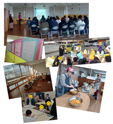 遊戯室では、東海市社会福祉協議会(地域福祉課)の方が来園し、保護者の方に能登地震での状況をもとに防災備蓄品や避難所などについてのお話をして頂きました。その後、地震を想定し、子どもと一緒に実際に駐車場に避難する訓練を行いました。最後に、おにぎりとカトレアの備蓄品(フルーツ缶・豚汁)を試食しました。…備蓄品の食べ物はどうだったかな???
