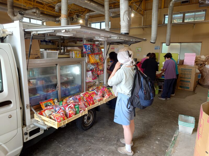 多くの利用者さんが作業の終わると同時に、「はじ丸まだかな、まだ来てないね」ととても楽しみにされています。お弁当やお惣菜、お菓子、カップ麺も売っており、その日の晩御飯や休日のおやつを買うことができます。アイスも販売しており溶けてしまうため持ち帰ることはできませんが、買ったその場で食べられるため、仕事終わりには美味しそうに食べる利用者さんもいらっしゃいました。「はじ丸」の訪問は、利用者さんにとって、日常の中のちょっとした楽しみと笑顔のひとときになっています。