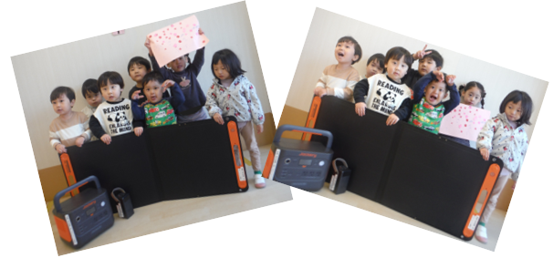 <カトレア>ご寄付頂きました! 2025/11/28 この度、愛知製鋼ボランティア基金様より、ご寄付頂きました。非常災害時に園児と職員が安心して過ごせるように太陽光パネルと非常用バッテリーを購入させて頂きました。有難うございました。大切に使わせて頂きます。