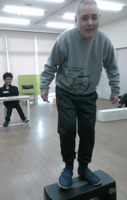 新しく取り入れた踏み台昇降運動を頑張っています。「いち!に!さん!」と元気よく数を数えながら行っています。その他にも、朝一番のラジオ体操から始まり、外散歩、トランポリン、エアロバイク、室内散歩、ボール投げ、フライングディスクに取り組んでいます。一人で運動に取り組むことはなかなか難しいですが、みんなと一緒に毎日取り組み、それぞれのペースで運動を行っています。日々の積み重ねが体力向上につながっていれば嬉しいです。
