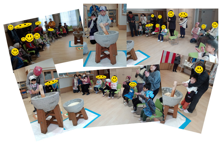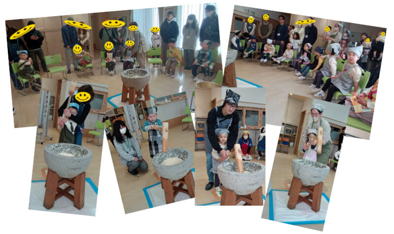 次は、クラスごとに1人ずつもちつき体験!「ぺったん、ぺったん!」順番もちゃんと待てるよ!