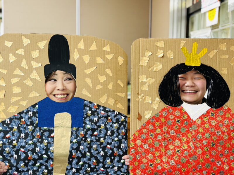 今回の目玉は、利用者さんと職員で制作した特製・顔出しパネルです! 金屏風をイメージした背景に、本格的な和柄の衣装。パネルから顔を出すと、あっという間に立派な「お内裏様」と「お雛様」に変身です。